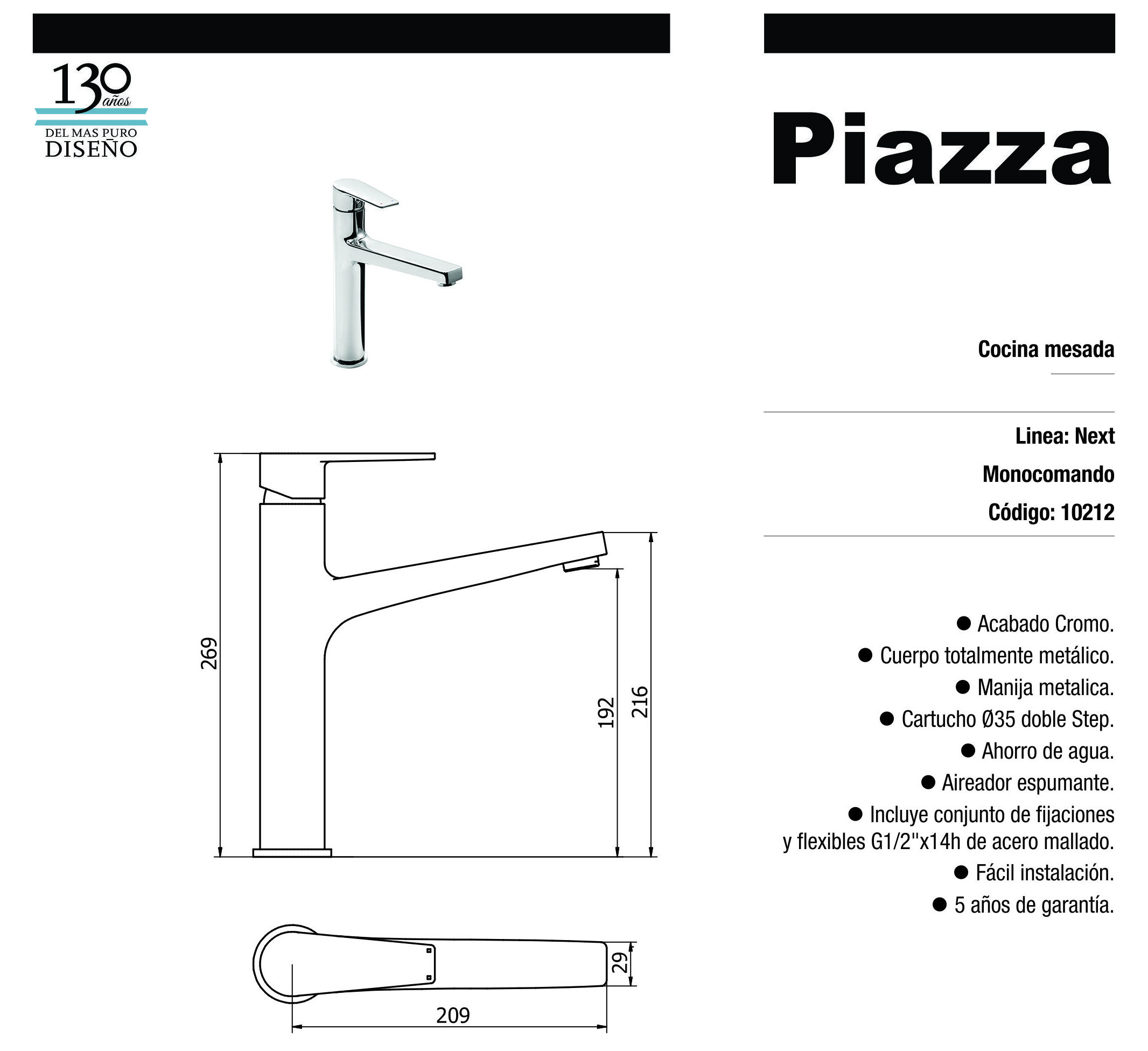 Griferia Monocomando Cocina Baño Piazza Next Alto 10212